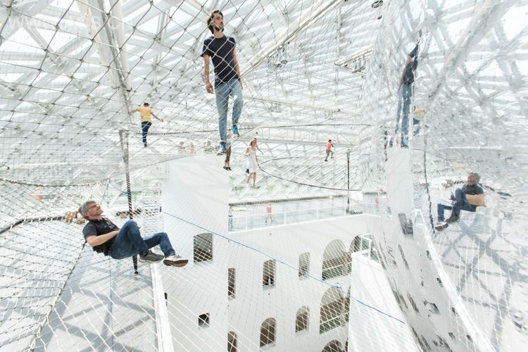 A gigantic installation work by Tomás Saraceno, en d “in orbit,” was assembled in the Kunstsammlung Nordrhein-Westfalen in Germany. At a height of more than 20 meters above the piazza of the K21 Ständehaus, Saraceno has suspended a net construction within which visitors can move, apparently weightlessly. Saraceno’s net construction, which is accessible on three levels, resembles a cloud landscape: those bold enough to clamber high into the web set beneath the glass cupola perceive the museum visitors far below them from the lofty heights as tiny figures in a model world.