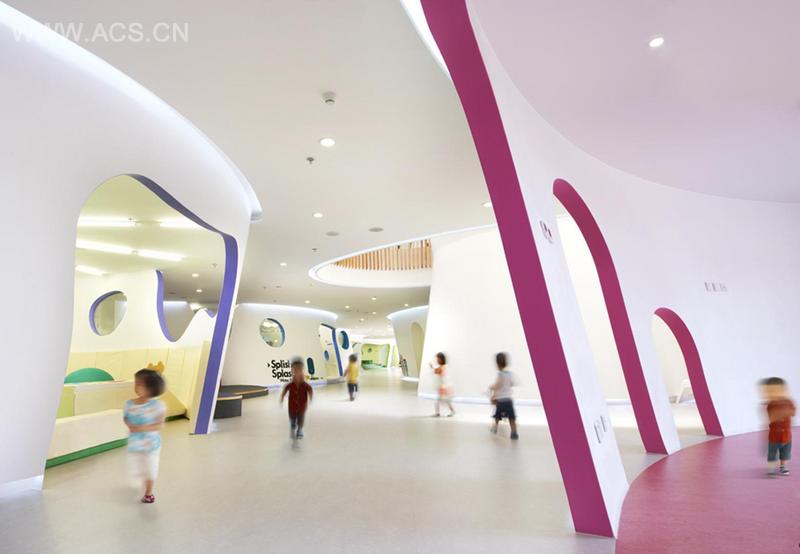 白色饰面和照明设施照亮了整个中心,打造出一个宜人的彩色主题,使整个中心充满了欢乐气氛。