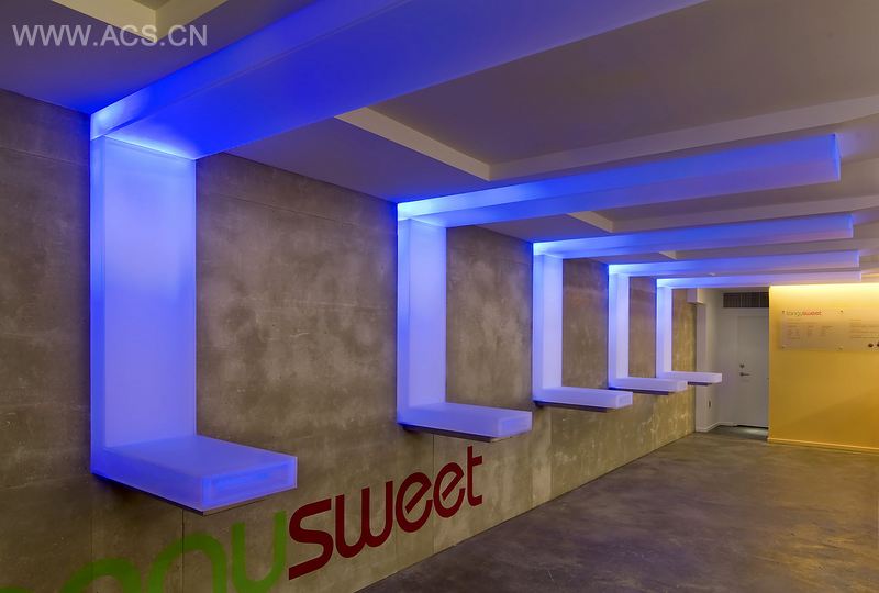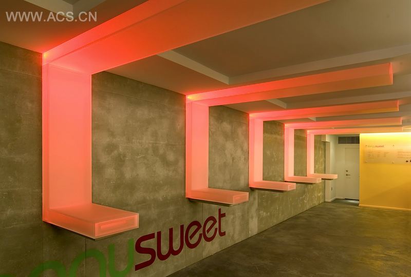 店主想要为他新开张的酸奶店打造现代前卫的室内空间。设计师依此目标,以新颖的手法进行设计工作。由于原有空间低矮、光线不足,因此巧用灯光是设计的重要一环。可以自由变换颜色的LED板成为救星,它们贯穿于酸奶店的整个空间,不仅是照明的主要光源,更是吸引眼球的品牌标识。夜晚走在华盛顿杜邦圈,包裹着绚丽荧光的Tangsweet酸奶店,一定能让你不由自主走近它。