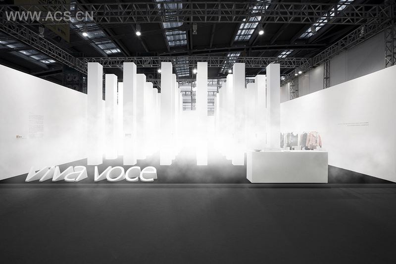 展台设计模糊装修概念,跨学科的结合白色迷雾和多媒体应用,在声、光、雾方面共同刺激感官,制造另类体验。
