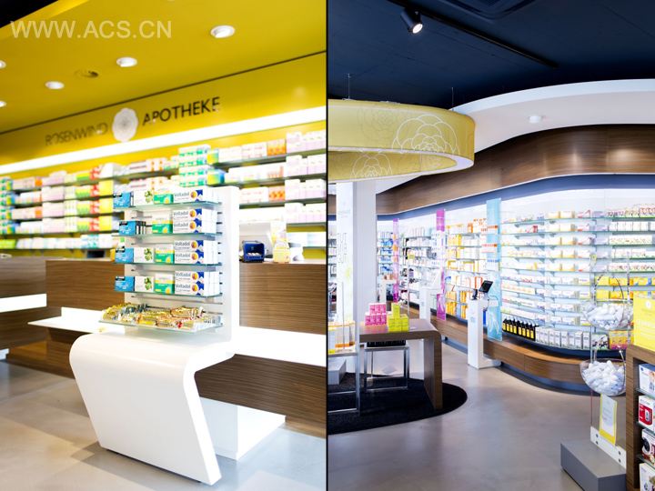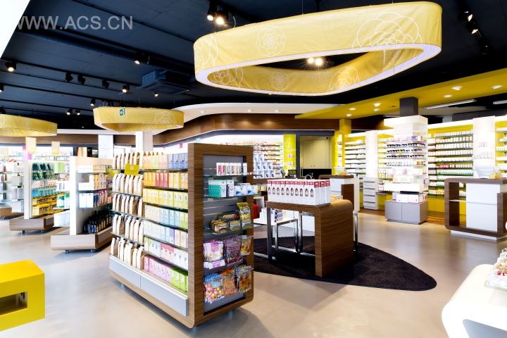 奥地利Rosenwind药店的顶部有几个黄色不规则形状的吊灯,吊灯的上面带有花纹,在起到照明作用的同时也装饰了整个空间。