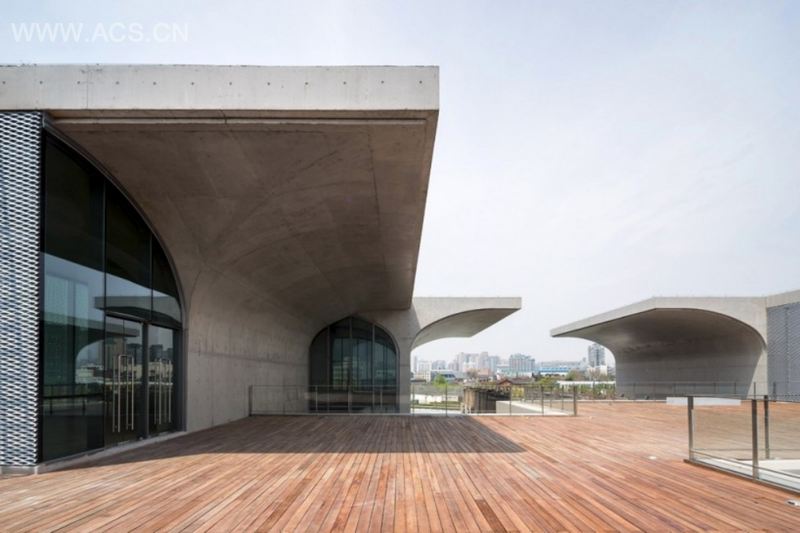设计中,最大的难题也在于如何平衡已有的地下空间和上部空间的关系,这既有对结构技术的考虑,也有对空间组织的考虑。最后我们通过一个跌落式的展厅巧妙地联系了地上和地下的展示空间。新的设计采用独立墙体的“伞拱”悬挑结构,呈自由状布局的剪力墙插入原有地下室与原有框架结构柱浇筑在一起,地下一层的原车库空间由于剪力墙体的介入转换为展览空间,地面以上的空间由于“伞拱”在不同方向的相对联接形成了多重的意义指向。机电系统都被整合在“伞拱”结构的空腔里,地面以上的“伞拱”覆盖空间,墙体和天花均为清水混凝土的表面,它们的几何分界位置也变得模糊。这样的结构性空间,在形态上不仅对人的身体形成庇护感,亦与保留的江边码头的煤料斗产生视觉呼应。