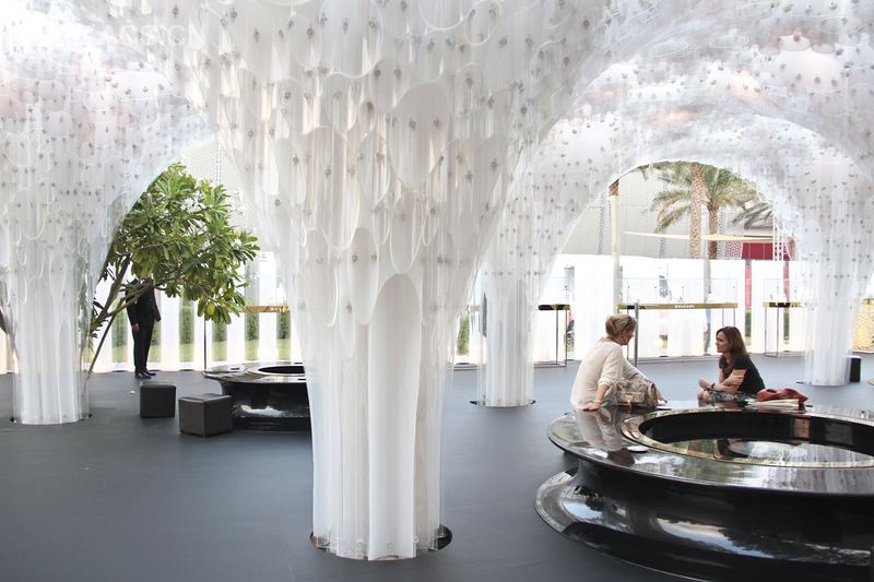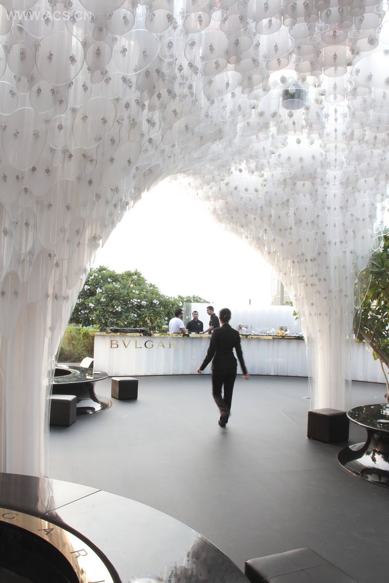 延续了扎哈·哈迪德为其设计的2011年阿布达比艺术博览会风格,宝格丽推崇新颖和充满创意的设计,同时鼓励年轻的新兴人才,委托NaNA为其进行本案的设计。