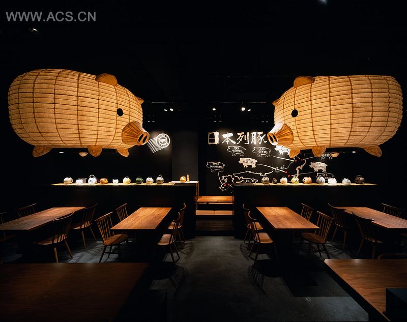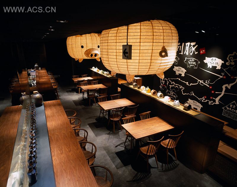 位于东京丰岛区的Sanenbutazou餐厅,占地114平方米,专门提供猪肉类菜品。餐厅的地板覆盖有灰浆,墙壁装饰有瓦纹墙饰面,天花板涂以乳胶漆。整个室内空间呈现出优美、冷静而饶有趣味的氛围特点。这个空间就像一个巨大的“猪”主题仓库,包括大大的猪图案纸灯笼,黑色的墙壁上也绘制有日本主要的猪养殖区地图。