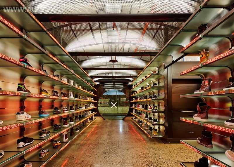 澳洲事务所March Studio设计的墨尔本Sneakerboy概念店近日完工。在如今的网络购物大潮中,过去的各种实体店都做出反应---也在网上售卖货品。而这个Sneakerboy概念店却希望将这种便利的购物模式带往一个新境界----成为一个不收现金也不线下售卖商品的实体在线商店,顾客在这个实体的在线商店中看真实的鞋子实物,然后试穿,最后再通过智能手机到线上购买自己心仪的款式。因为商店只放样货而不设库房,因而商品争取到更多的展示面积。