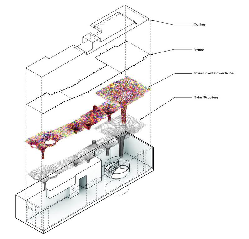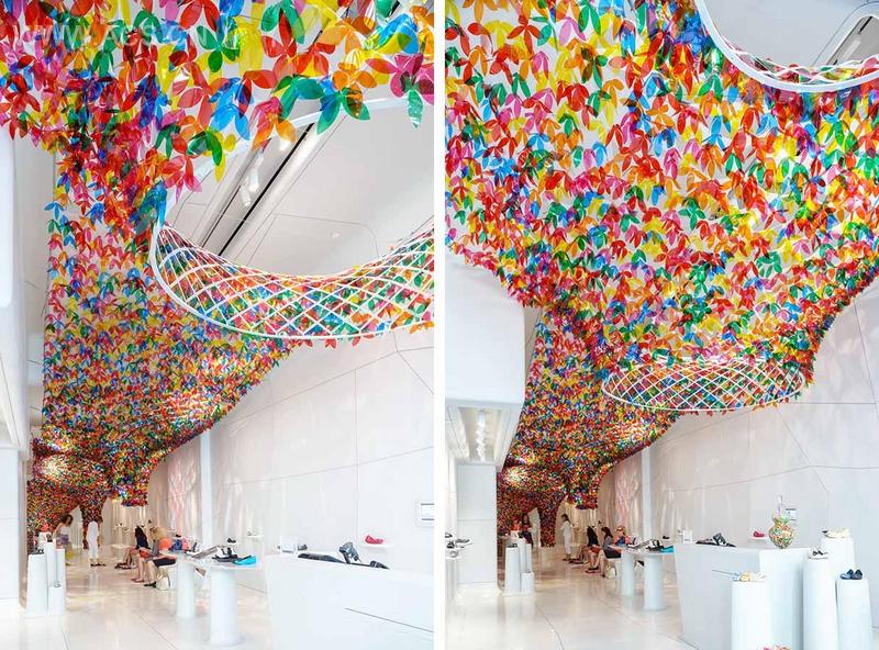 在纽约梅利莎鞋廊,SOFTlab设计室创作出以“绽放的花朵”为主题的鞋廊设计。设计师将梅利莎鞋业精致自然的收藏品与设计技术及工艺探索相融合,巧妙地设计出绚丽多彩的花树冠装饰Melissa鞋廊。该花树冠悬挂在整个天花板上,以20000多朵半透明花朵与4000块独特的晶格创造出波动起伏的空中花海效果。花树冠的表面材料为聚酯薄膜和丙烯酸,通过激光切割成特定的晶格形状,并使用金属孔眼固定晶格两面,使其连接成网。该花树冠具有良好的通透性,可多角度捕捉瞬息万变的光线,在光影朦胧中花朵绚丽绽放,色彩斑斓。