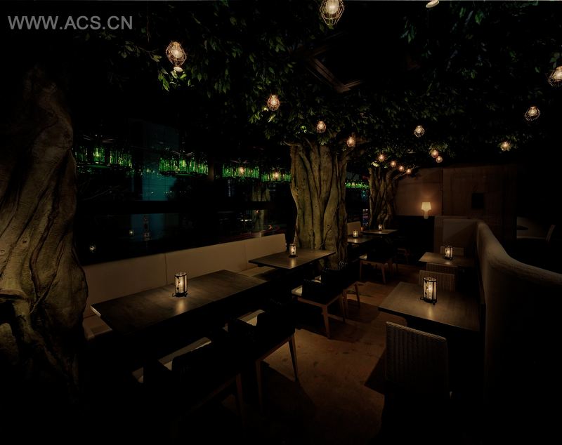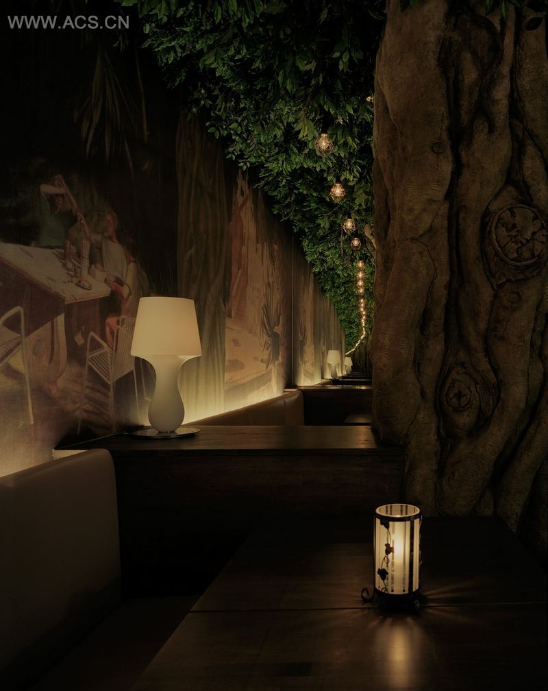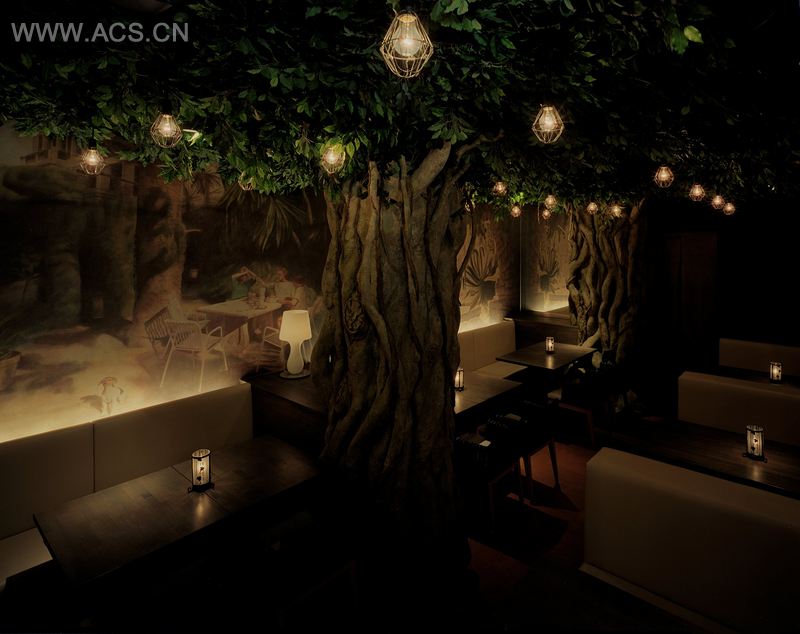 这家餐厅将在大树“gajyumaru”下用餐的梦境变为现实。这里设有人造树枝和混凝土树干。 私人包厢由布料构成,形如露营的帐篷。另外,独特的枝形吊灯是由绿色酒瓶组成。为了避免挡住顾客的视线,厨房设置在餐厅中心。