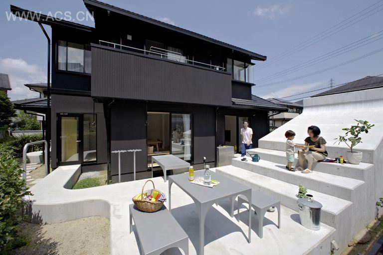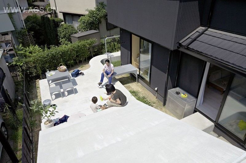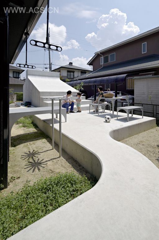 When this young family bought this house in Ikoma, Japan, the space behind the house was a dull parking space. It wasn’t a place to spend time in, and enjoy some outside life, so they hired SPACESPACE architects to improve the situation. The space was reclaimed by creating a concrete carport at the edge of the property, that has steps for sitting on the other side, as well as space for a table and chairs.