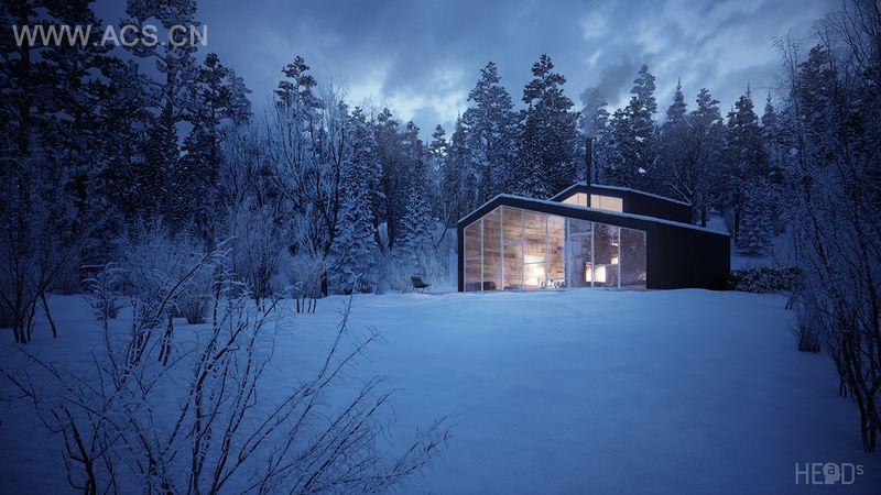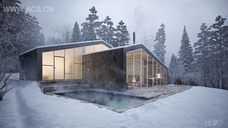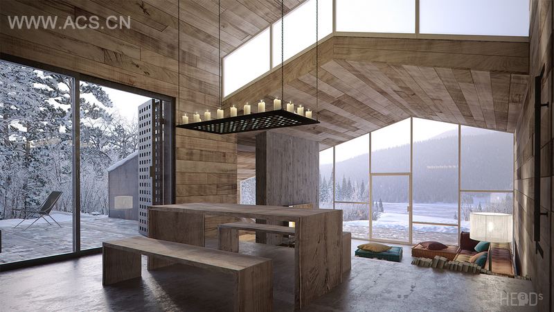 This vacation house/mountain cabin, is located on the Durmitor mountain in Montenegro, just nearby the national park, on the territory of Zabljak municipality overlooking beautiful Black Lake. Because of the sloping terrain house is split into cascades, with upper and lower level, which makes a nice relationship between kitchen/dining and living space and provides nice passive lighting. The interior is completely oriented toward the landscape with its transparent facade, made of insulating glass. Walls and ceiling are cladded with wooden planks, which gives the sense of inviting warmth. The central place of the house interior is the fireplace , made of the exposed concrete, with the wooden planks texture. It subtly divides living from sleeping area. In contrast to the wooden walls/ceilings, floor is covered with smooth concrete and firstly gives an impression of cold surface, but is actually heated with floor heating system using geothermal heat pump. The interior extends to exterior through a spacious deck with the thermal pool. The design of the house is simple in form, with elegant lines and dark l cladding on the outside.