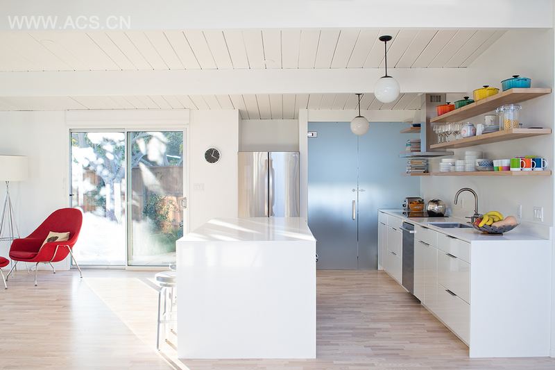 What was once a disjointed set of rooms were all combined into one large great room, complete with a new kitchen. The open, modern design space admits light and openness to nature and allows this family with small children to live together in comfort.