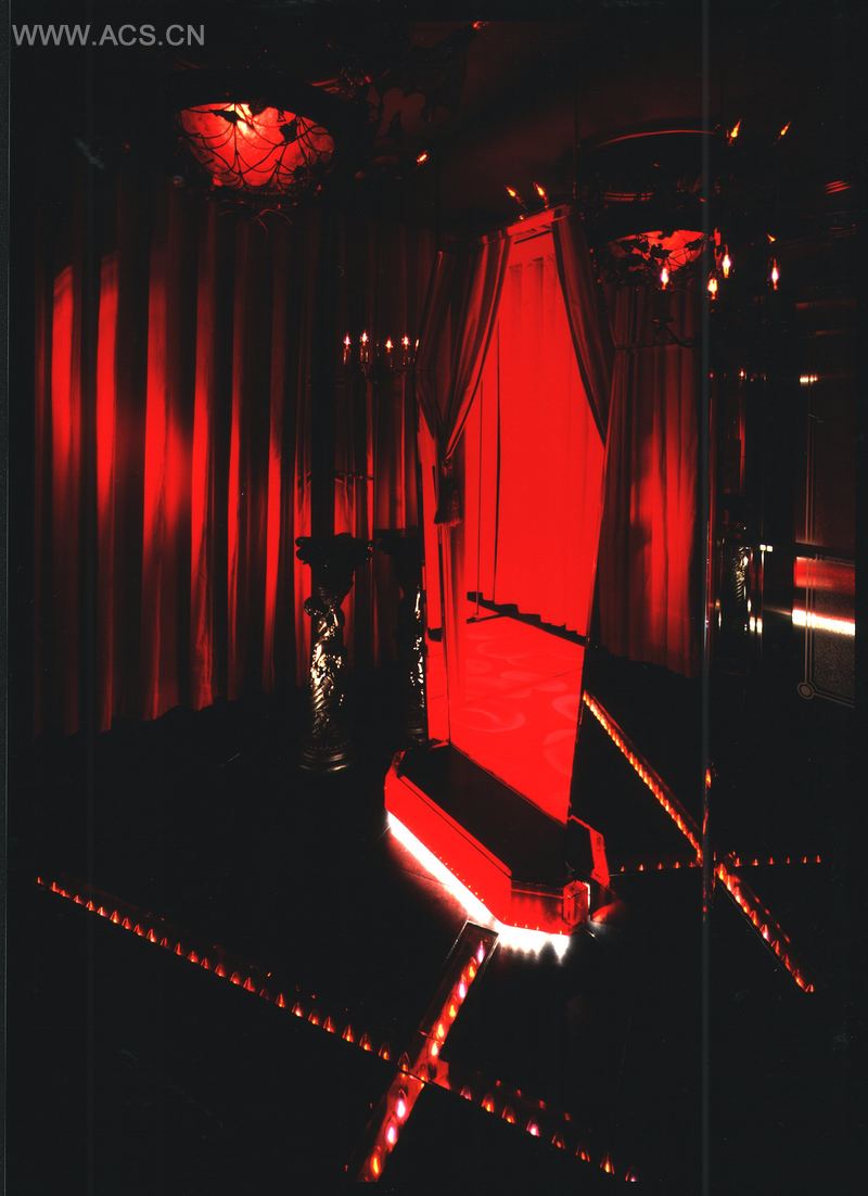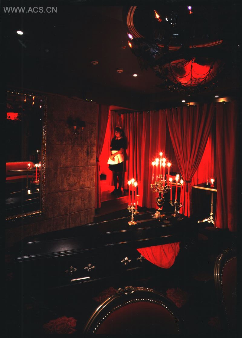 这家餐厅的主题是吸血鬼传说。颜色设计十分单一,突出了红色的天鹅绒帷幕和黑色的棺材。 走廊里设有显示血液显微图的灯箱。 枝形吊灯的设计以蝙蝠为基础,目的是增添华丽的氛围。