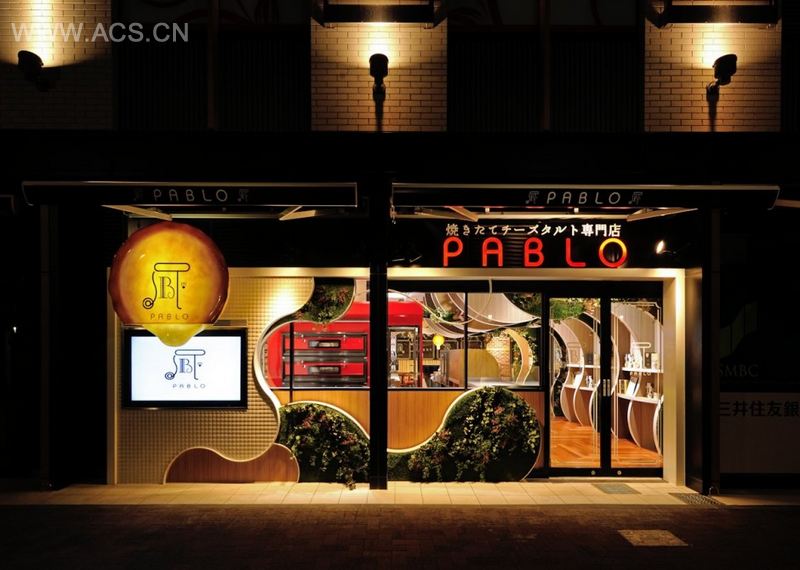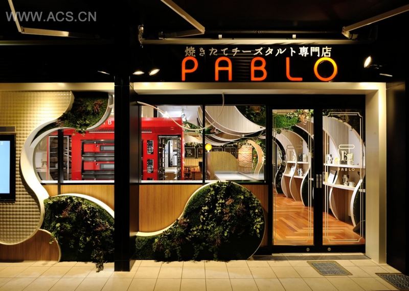 用原木打造出翻滚效果,加上绿色植物的嵌入,一家丛林风格的芝士挞店。