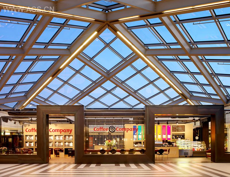 四个入口都设有钢制的蓝色拱门。为了提供亭内座位区,设计师设计了钢制的蓝色长椅。拱门与长椅连接起来形成了一种新的结构。这种结构被拱门内的玻璃封闭起来以创造真实的室内购物空间。
