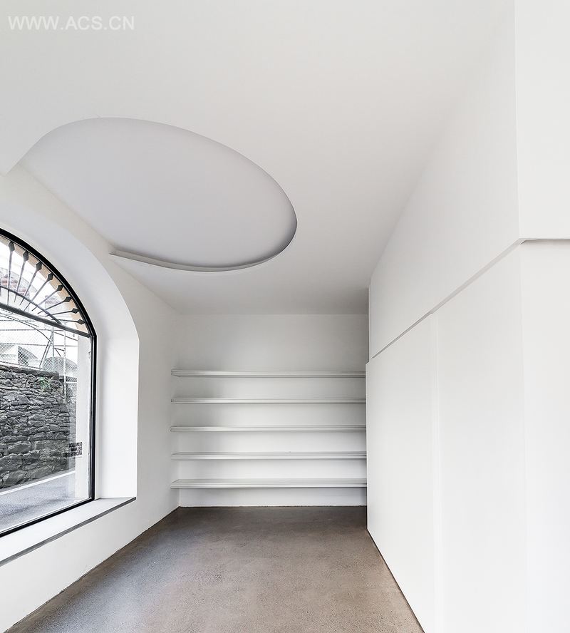 L'edificio si articola su cinque livelli due dei quali non visibili dalla strada perché incassati nel pendio della collina. I locali dello studio si dispongono a piano terra con ingresso diretto dalla strada e nei due piani sottostanti affacciati sul cortile interno. Il progetto di sistemazione rispetta l'impianto tipologico e i caratteri spaziali e materiali degli ambienti, limitandosi ad una loro valorizzazione e rimessa in funzione.