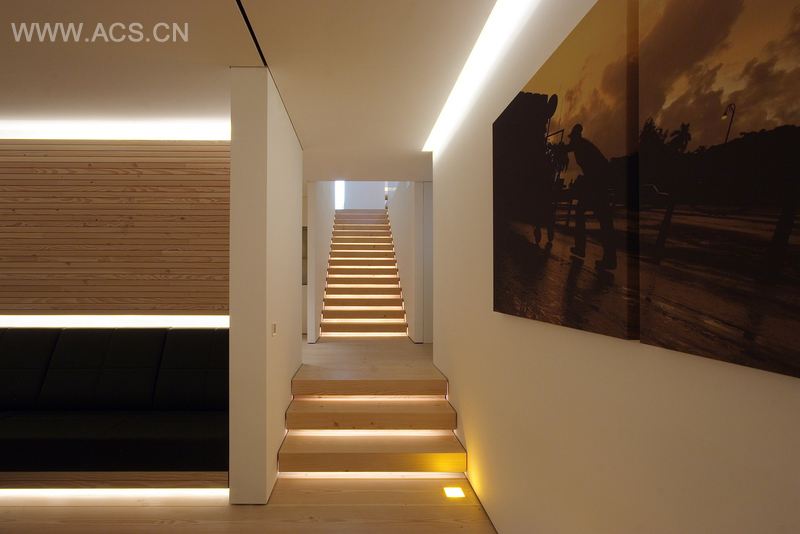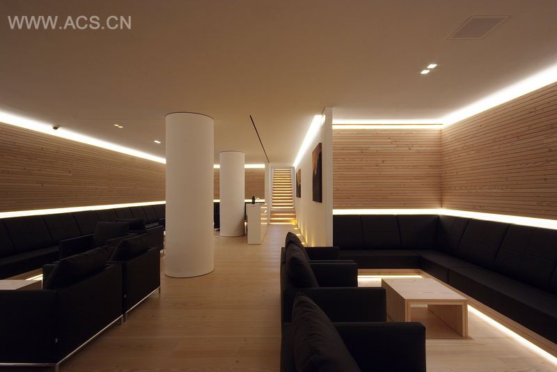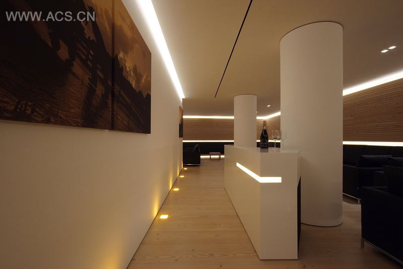 这个空间位于一栋20世纪大楼的基层,俯瞰着拱形游廊。游廊环绕着一座美丽的中世纪城堡,城堡包括乔尔乔涅家乡的历史中心。这个项目强调了纵向初始形状,创造出一种重要的生活观念。另一个显著特色是天窗的设计,朝大楼内庭开放。 新空间被组织为两个功能区:第一个是服务区,由一个线型长柜台构成,被白色 可丽耐石覆盖,底部有一个光槽,为空间增加光亮感。第二个是顾客专享区,特色在于装了软垫的白色皮制长凳,纵向延伸并在尽头处沿着墙壁转弯,目的是突出连续性,尽可能地将这个空间包围起来。为了最大程度地展现视觉,较低的天花板上以及长凳靠背的上方都设有线型灯槽。