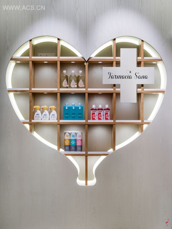 以往的药店药品摆放都是中规中矩的,我们在选择药品的时候,只会针对自己的需求,买完药就离开。但是S´ana药店的室内设计,有多种不同造型的货架,将药品摆放成不同的形状,即可爱又独特。室内装修选用鲜艳的颜色,一进去就仿佛置身于一个糖果店,想多逗留几分钟。