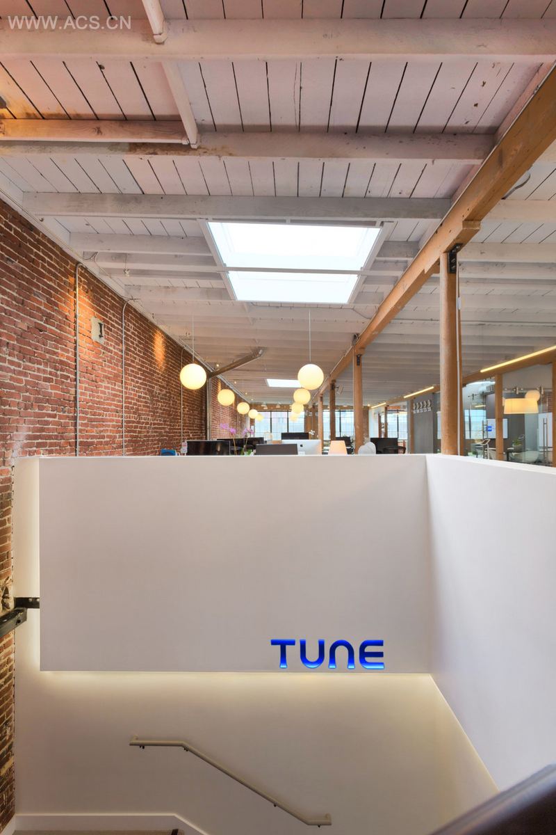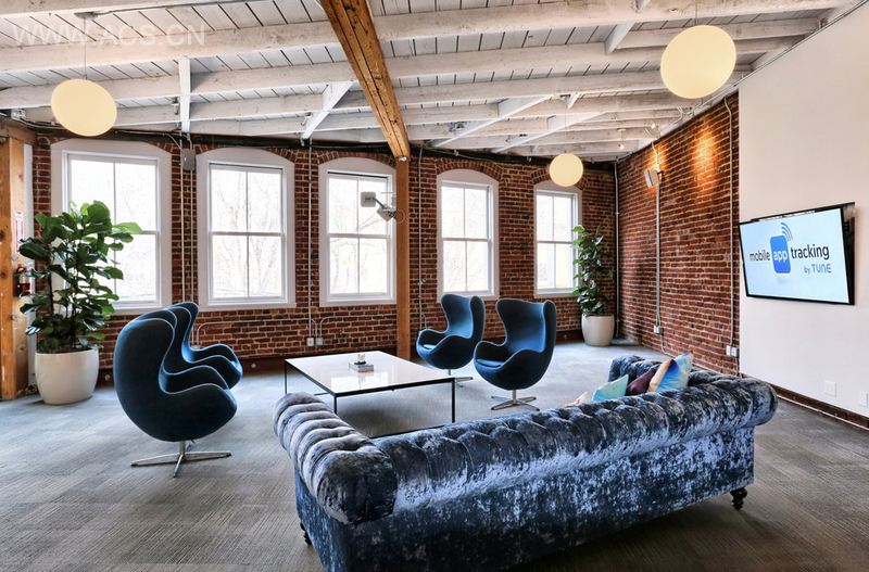 办公室融合多种风格,古旧的砖墙,加以时尚的竖条纹地铁,或大片的绿地,工业风中加以时尚、自然元素。垂吊的球形灯具给空间以漂浮感。
