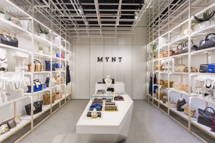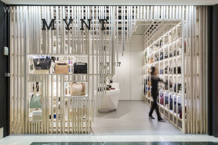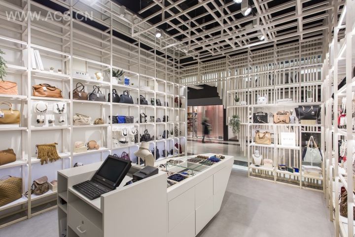 该项目利用垂直木条打造店铺门面,中间的船型展示台兼具收银台极具特色。