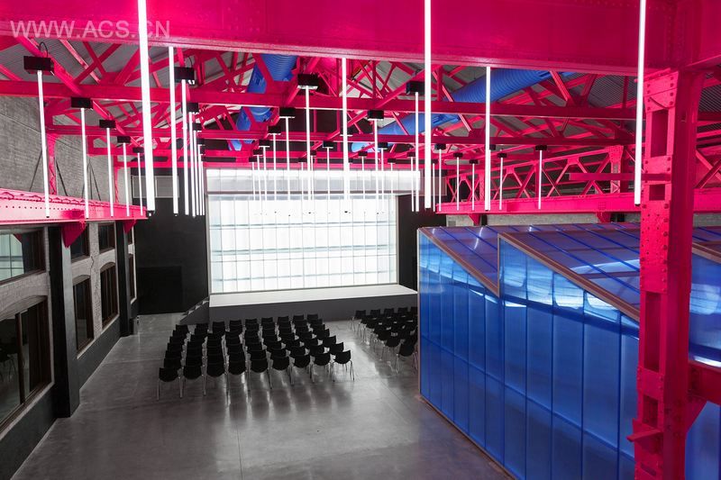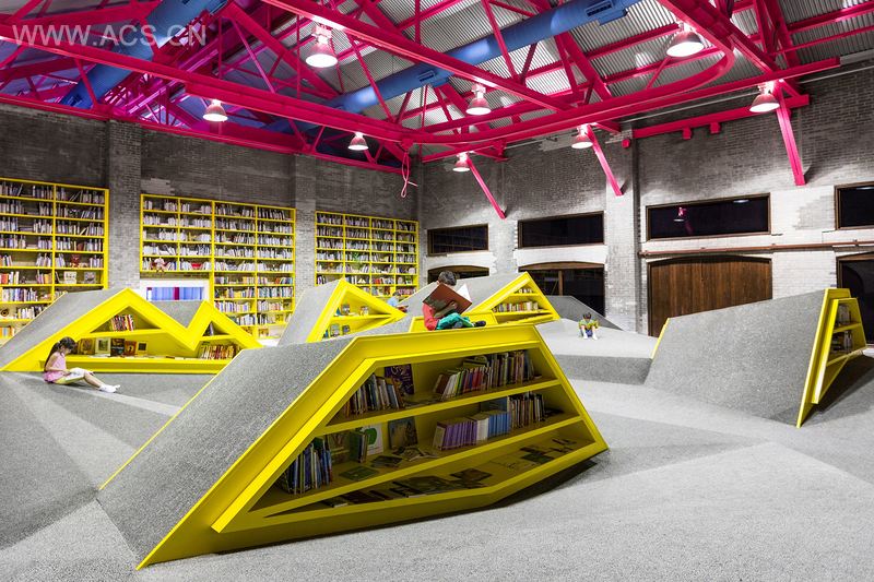 The result is a multi-purpose, asymmetrical reading platform meant to simulate Monterrey's mountainous topography. The bookshelves are not only used as storage, but serve as a dynamic space to play and learn, to fire the imagination and provide comfort while reading. The installation's colorful and geometric aesthetic contrasts directly with its antique, industrial building, elevating both elements in a cheerful and unique way.