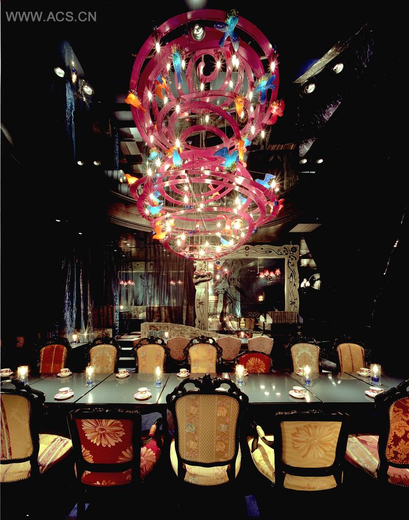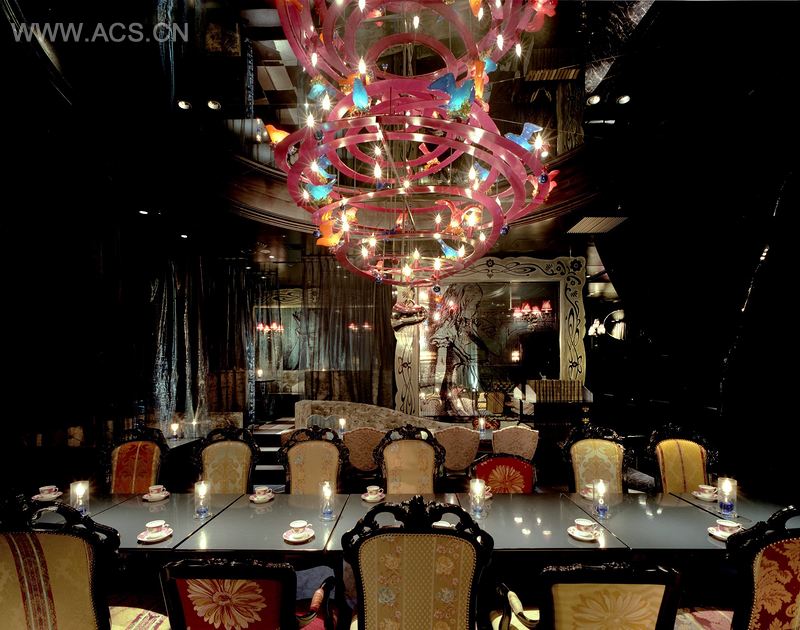 这是第二家以爱丽丝奇境记为主题的餐厅。室内有高高的天花板,设计师设计了独创的枝形吊灯,带有浮动丝带和小鸟的图形。他们还设计了带框的大镜子,使顾客感觉到自己变小了。