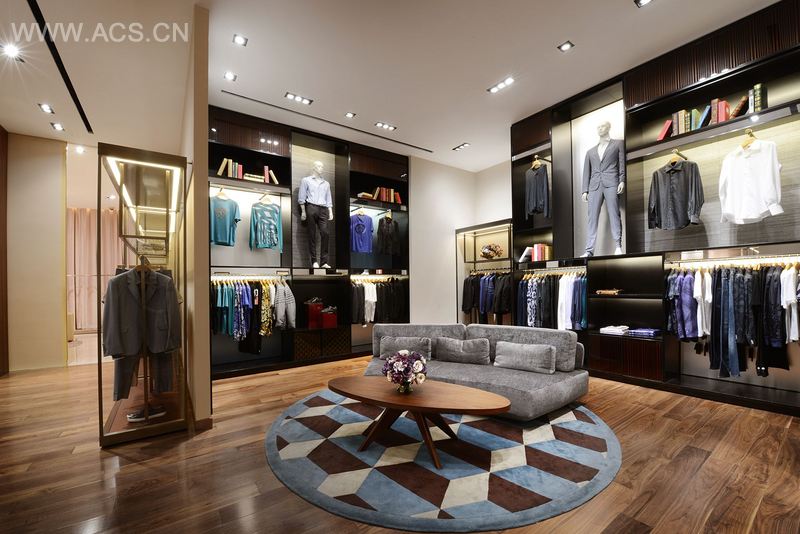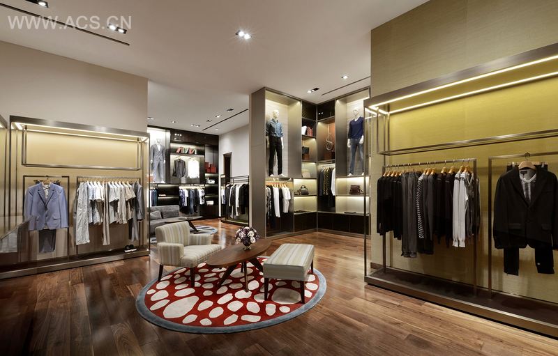 延续着温暖如家的氛围,大量的陈列架遍布每个角落,让人联想到文雅的图书馆。楼下,陈列架用暖色调的木材制成,这些犹如图书展柜的陈列展示了模特儿、各种饰品和别致的名牌服装。陈列柜后面都采用金色壁纸和彩色磨砂玻璃作为衬托。一排排的书籍和间隔空间都装饰着色调柔和的染色玻璃,将不同的区域分开,赋予丰富多样的变化,创造出舒适自在的感觉。在其他地方,鲜红烤漆的陈列架上独立地展示各件饰品,份外醒目。