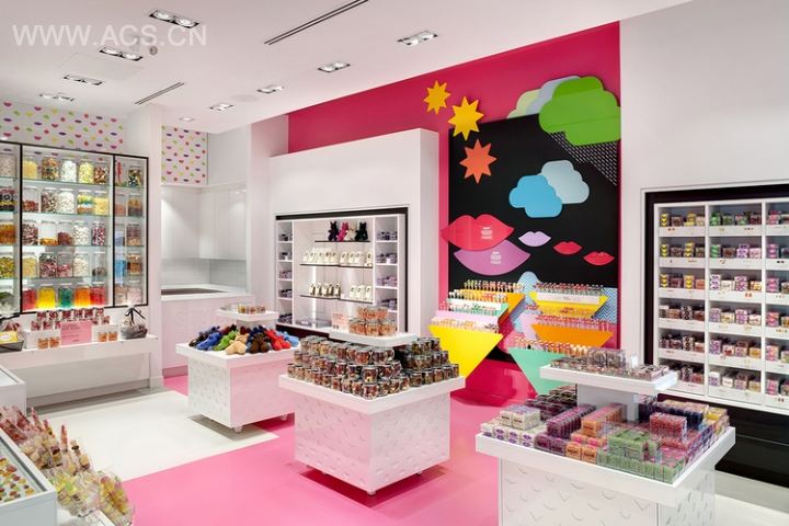 以白和粉为基调,加上缤纷的糖果,整个店面显得甜蜜清新。