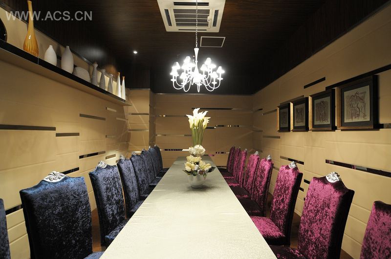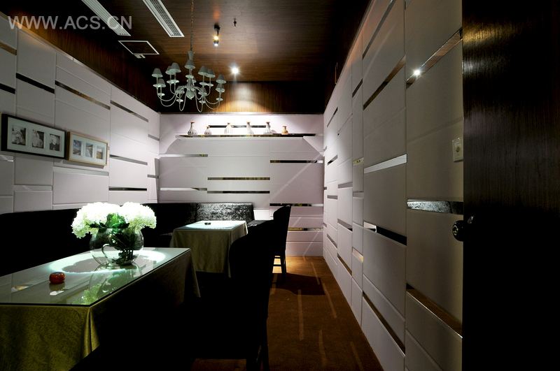 环境的气氛营造上是安静、高雅精致的,回避喧嚣,减去了一份奢华,将餐饮与文化融合在一起,用现代化的手法表现环境气质。室内景观装饰元素展现出另种的意象气节,入口处大面积木块叠加装饰墙为环境提供了一个很纯粹背景,给人遐想空间,与吧台收银台以及灯饰起到完美结合。奠定了餐厅现代简约风格,适度实用金箔饰面,渲染空间环境的尊贵,但是不奢华,传递出的是一份厚重的高贵,让来这里的人们开启一场属于心灵、味蕾双重之旅。