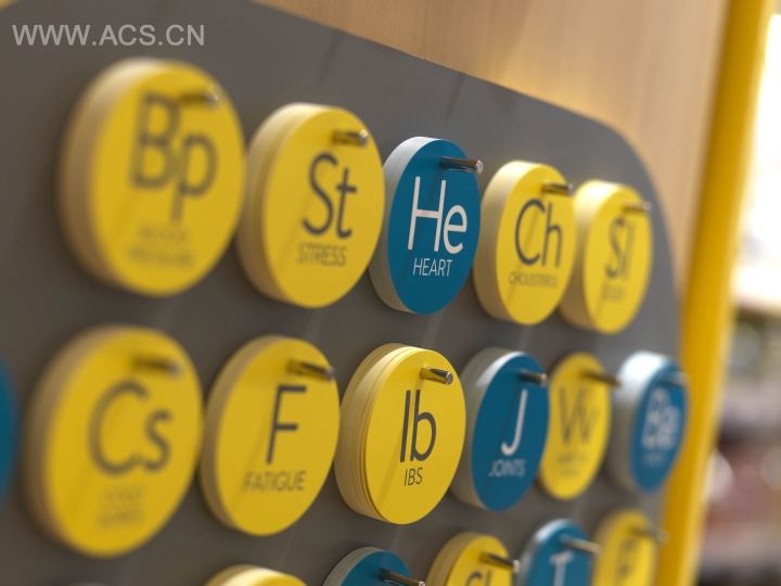在2014年,NutriCentre看中了一个商机,他们觉得是时候改变下英国公众对与健康的看法了。为了能够撼动健康零售业市场,他们需要打造出一个既能体现产品价值,又对公众有吸引力的店铺,并且,店铺的设计还必须得具有活力。因此,他们邀请Yard Creative设计团队用创新的方法帮他们实现这个非同一般的目标。设计的重中之重是打造出一个既包容乐观又让人觉得极具专业性的地方。那些对健康知识知之甚少或者一无所知的顾客,可以在药店前部那两个温暖怡人的地方得到所需要的帮助。这两个地方,一个是具有得力熟食店风格的区域,不管顾客对健康零售是否感兴趣,他们都会被这里的风格所吸引。另一个地方是一些展示台,顾客们可以在这里了解到什么是营养品,以及它们对人体有什么益处。
