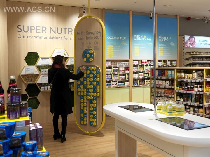 对于那些相对比较专业的顾客,店内给他们的分类和引导就比较简洁,只是一个上面写着一些产品信息的展示架。用刚柔并济手法做成的店招很有魅力。店面很开阔,这样顾客们可以更容易了解该品牌以及它所提供的产品服务,这种做法相当独特。NutriCentre如今正在用拓展品牌影响力的方法,来帮助英国民众提高健康意识。整个设计工作包括体验映射、品牌宣传、广告文案、店的概念设计、技术设计和品牌准则的规划等。