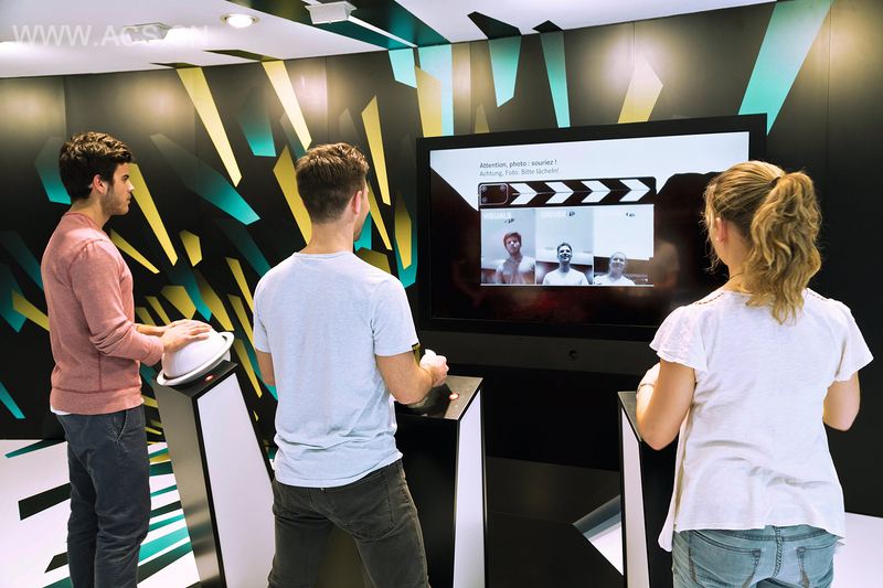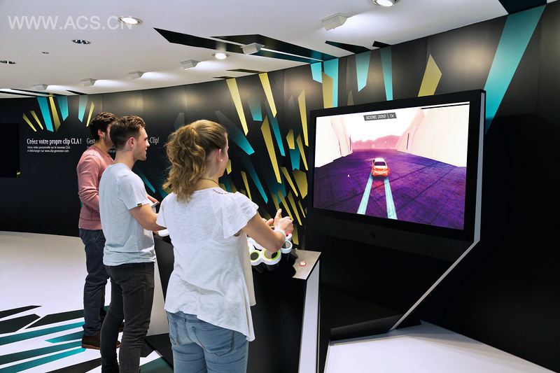 在交互游戏站中,多个游客共同创造出其独有的视听世界,享受动态驾驶乐趣。每个参与者都有其特定的任务,驾驶人指导正确的方向,VJ调节数字景观,DJ制造音效。这种有趣的互动界面,不同寻常,显得更为直观,能够很好地指引游客参与互动体验。一个视频完成后,会立刻自动上传到奔驰汽车的脸谱网主页,可以点赞,也与朋友们分享。