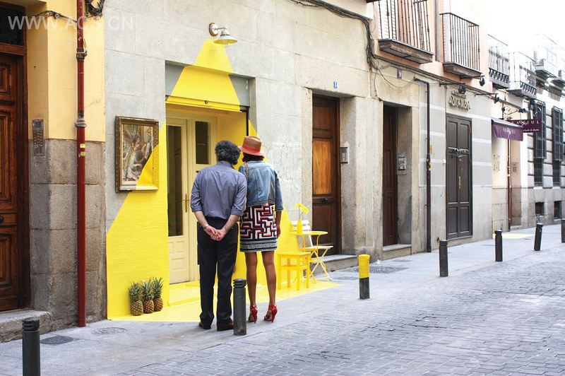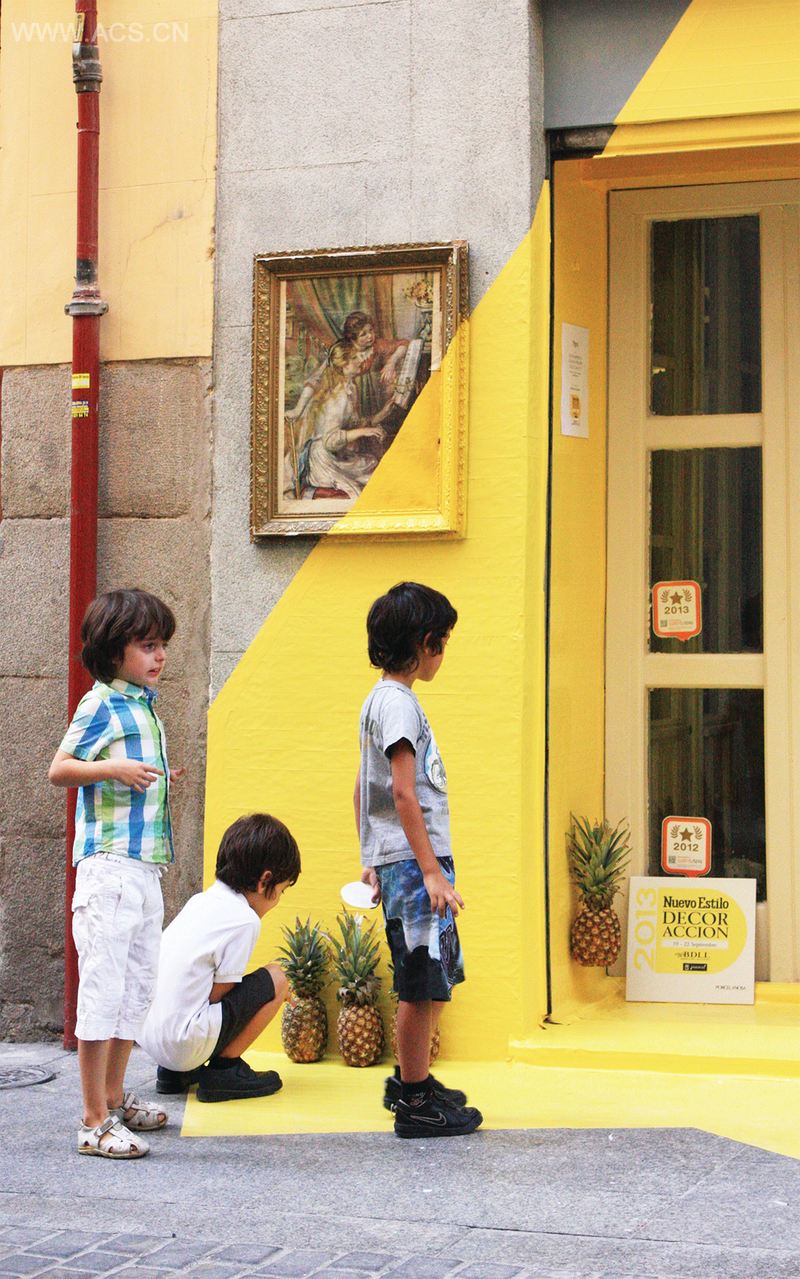 (fos)是(fos)团队设计的第一个装置名称,也是团队的名字。fos在加泰罗尼亚语言中的意思是融化,在希腊语中的意思是光亮。在马德里的Rayen餐厅外墙上,250米长的黄色胶带如同灯光一样照亮了4个昼夜。装置给人以幻象,仿佛是人造灯光从餐厅入口顶部照射下来的。利用胶带、凤梨、涂漆的艺术品、草坪家具和灯,(fos)创造出一种介于透视和色彩体量之间的视觉场景。胶带包覆了水平和垂直表层,随着横梁的形状创造出一层黄色的皮肤。胶带仅仅覆盖着从前门望去灯光能覆盖的区域表层。这最终形成一种视觉游戏,吸引着路过的人们的注意。