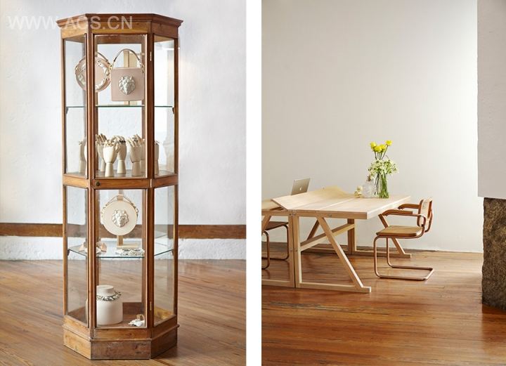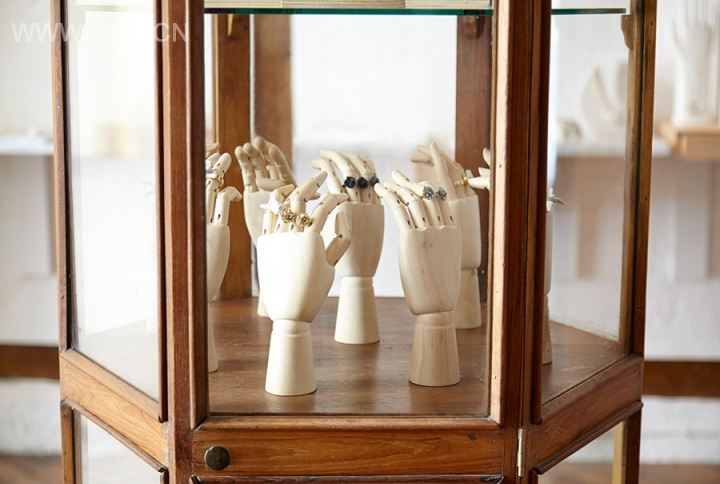 以原木和乳白为主基调打造了饰品展示空间,很好地将商品美学与空间美学整合,传递店面的“美”,展示厅后还有一个私人工作室。