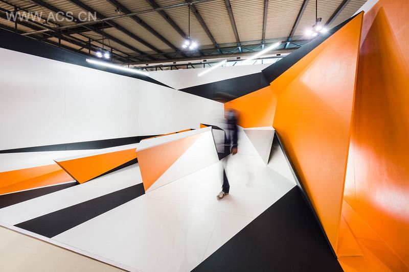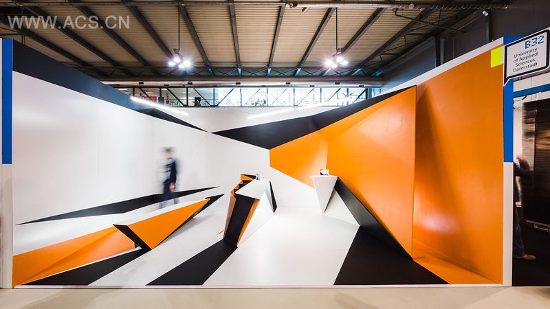 Trillusion explores possible relations between furniture and space. does furniture define space or is it the extension of space? How can furniture adapt to space and vice versa? The three basic furniture elements seating bench, bar table, desk and backwall are arranged in a 6m by 4m space and complemented with graphics on the floor and walls.