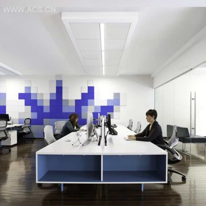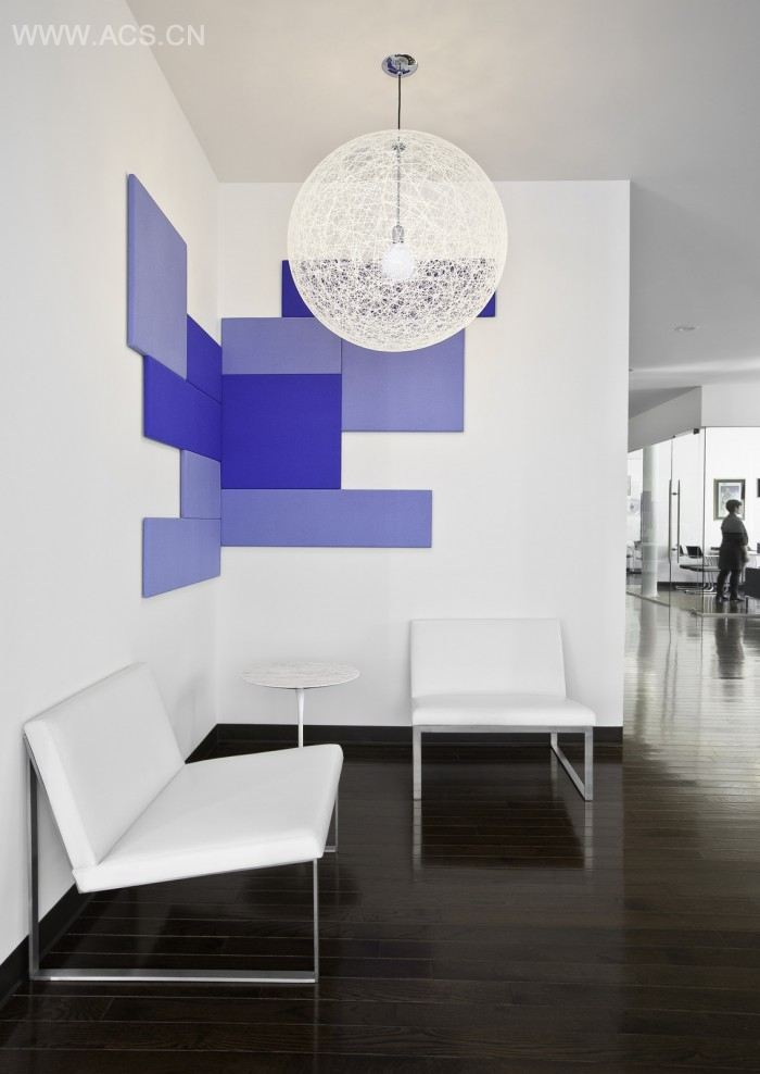 办公区域墙上的色彩拼块十分亮眼,紫色,浅紫,浅灰,白色四种颜色采用方格拼接,形成动态感。所用家具也十分有特色,S型沙发,黄蓝拼接沙发等。