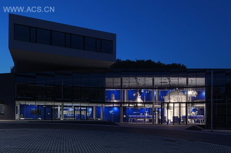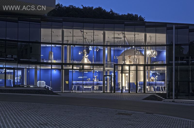 顺应场址的地势,DLR论坛的建筑如同一个巨大的展示橱窗,欢迎游客的到来。透过凹曲的8米高玻璃,人们可以站在外面看到内部的展示空间。建筑本身就是一个陈列柜,其间有两层楼的展示空间,搭配着深蓝的背景色,仿佛是漂浮在空中。