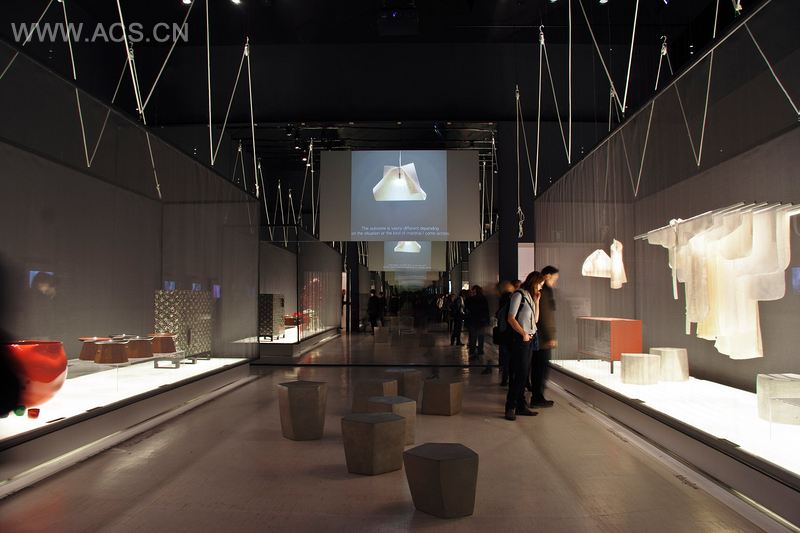 在中性的环境中,悬挂的薄膜保护着展品,将其用薄薄的透明织物覆盖着,与环境隔离开来。上方是电缆和滑轮的结合体,让人回想起制造业的传统;下方是两个长长的白色灯箱,艺术品被包覆在光线中;背景墙面上,11段短片中的详细讲述,引导人们更深层次地了解每件艺术品。
