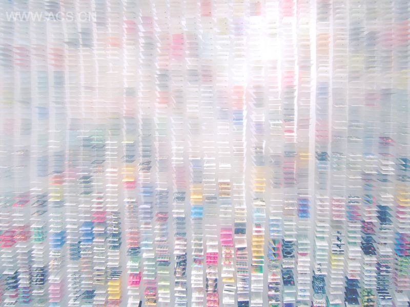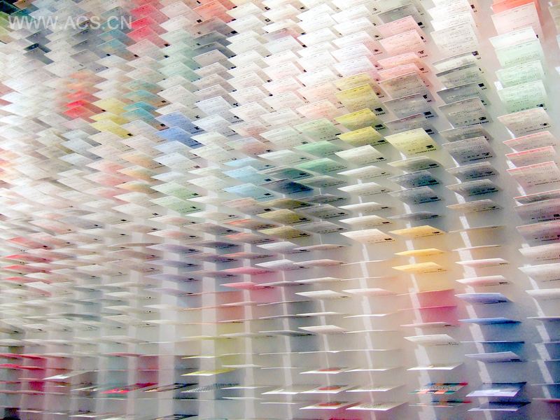 设计师旨在创造一个容纳200多张名片的场所,展示每张名片与整体之间的微妙互动。设计师将名片插入聚苯乙烯泡沫中,将纸张易碎轻盈的特征体现在其所处的环境中,同时增强名片、支撑物和环境之间的关系。游客拿走感兴趣的名片,改变了展品的密度,反过来改变其自身的焦点,最终形成复杂而美丽的立面。每一刻都在改变,如同日本的樱花树。