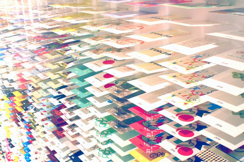 展览设计围绕着奥林匹克运动的主题,是一个让来自世界各地的人们聚集会面的空间。其间有200名艺术家的商业名片作品,上面用黑色写着设计师的联系方式,参观者可以自行拿取。