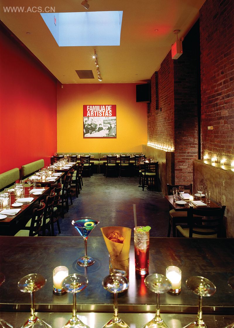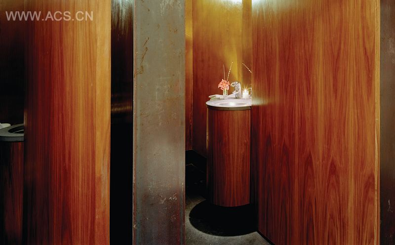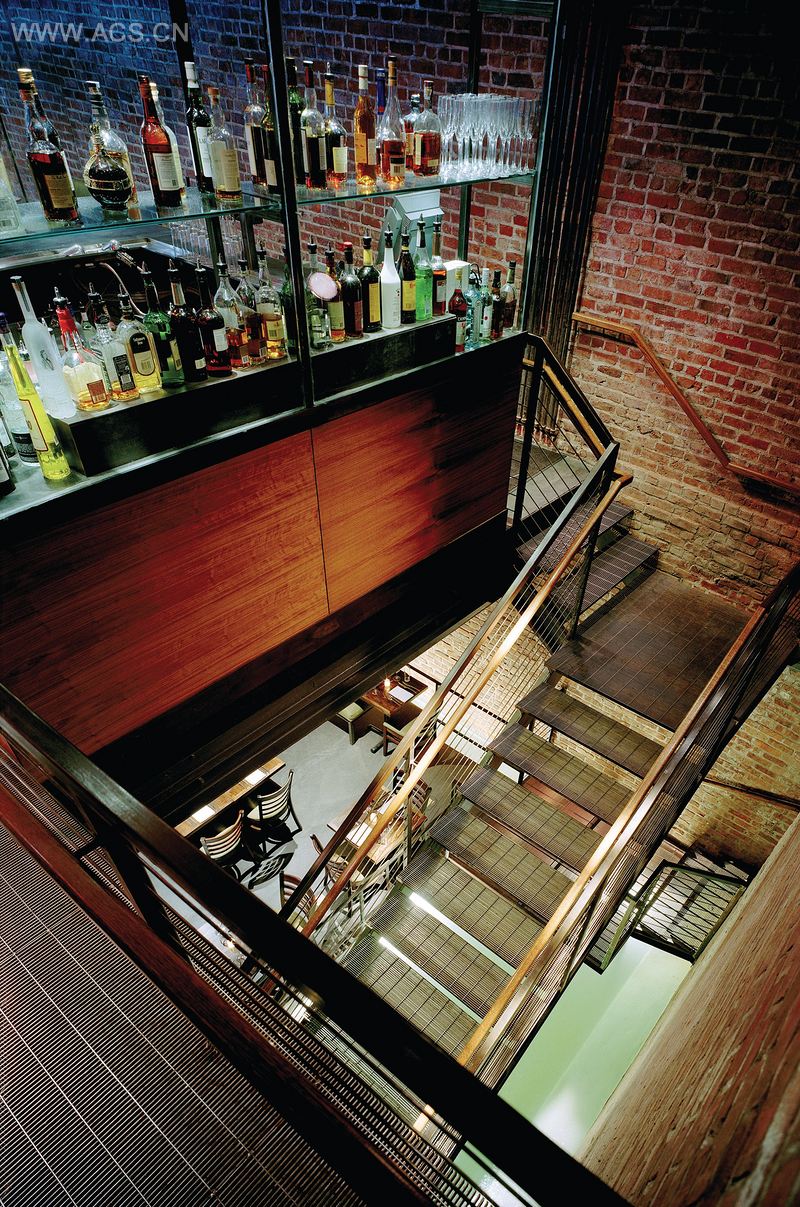餐厅面积为4000英尺,共三层。进入底层的餐前酒廊,迎面将看到各式各样的豪华设计,包括以核桃木和金属打造的摩登吧台。不锈钢楼梯架于18英尺长的倒影池之上,将人们引入有着柔和光线和砖石穹顶的接待大厅。人们可经大厅的电梯来到主用餐区,14英尺的高度使这里的空间宽敞无比,中央位置的水池之下设有50盏射灯,更有喷泉装置制造缓缓水流,为人们带来无与伦比的就餐体验。
