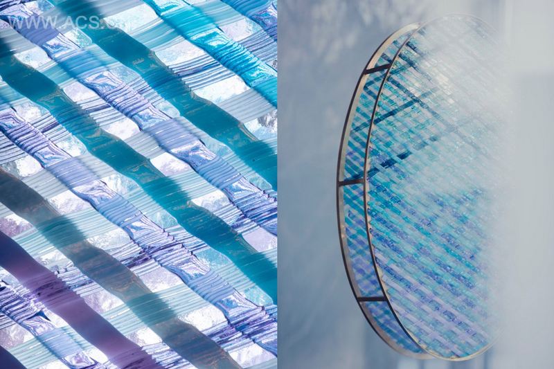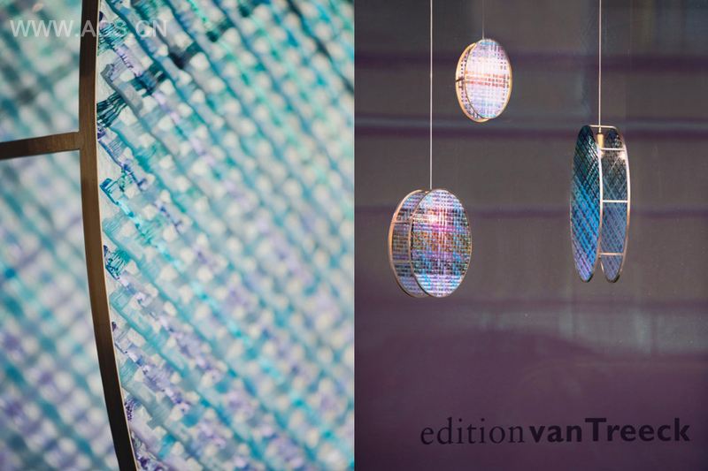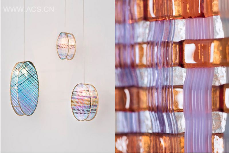 采用传统的传统的编织技术处理玻璃材质而成就的五彩剔透的吊灯。编织通常需要的是一种灵活的材质,比如易于弯曲的纺线。为了获得同样的效果,彩色玻璃条纹需要在窑炉中制成,以实现编织不同层次的玻璃的工序。透明色的变化曲线重叠混合,在光线影响效果下,形成了一种有织纹的玻璃表面。