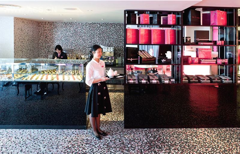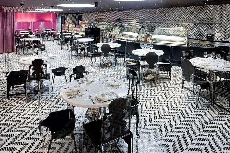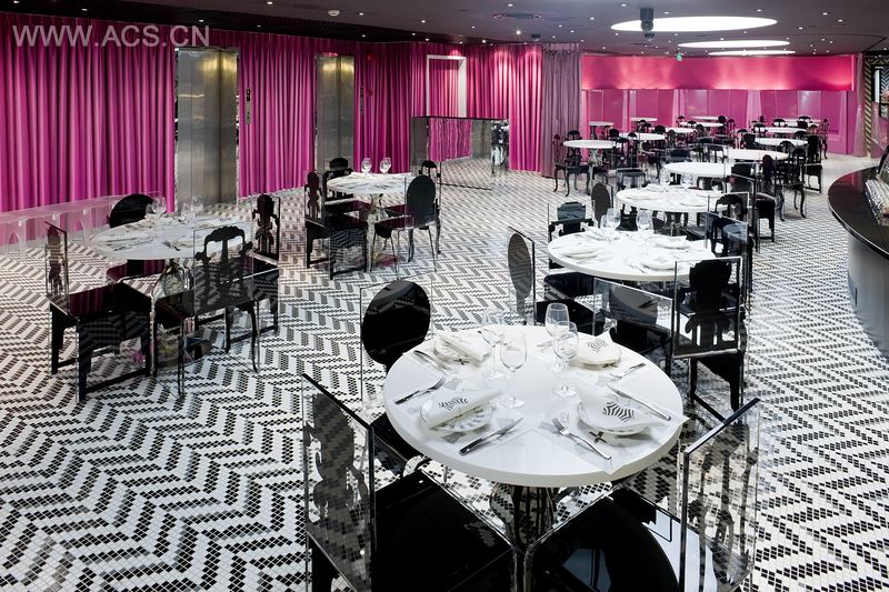 餐厅选用简洁而鲜明的色彩,包括白色、黑色和粉色。人字形图案的地板和墙面,是对芭比的人字形泳装的致敬。1959年,芭比娃娃穿着人字形泳装,在纽约玩具展上完成首秀。