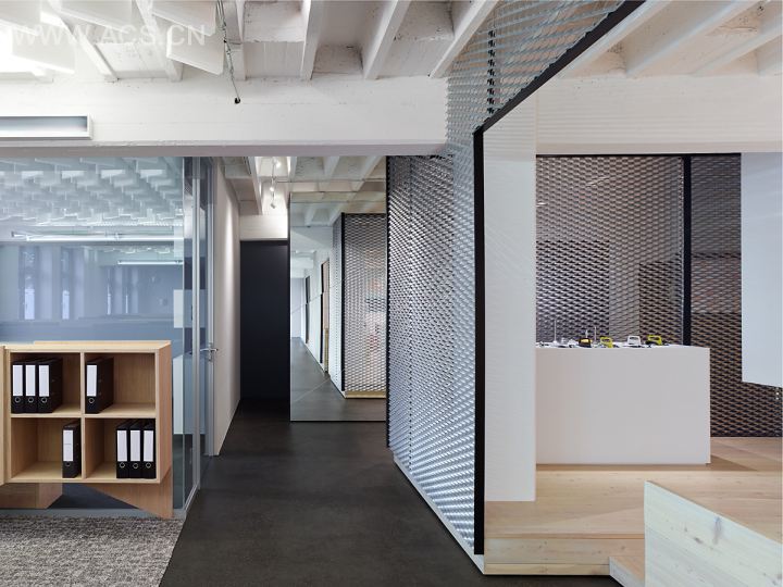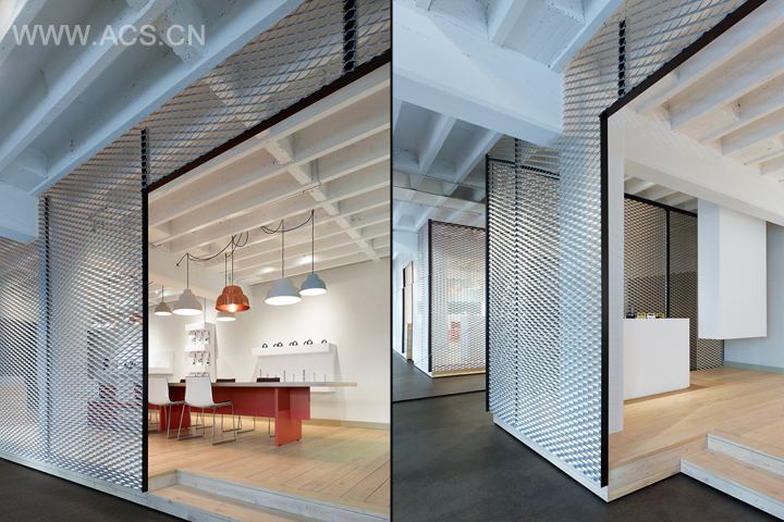 Movet办公室在中心空间设计了公司的核心功能区,包括会议室、办公室小厨间、陈列室,还有一个通透的金属屏风,客户可以在这里稍事休息,随即办公室的员工就会立刻接待他们,然后转入建筑核心,开展常规的业务。