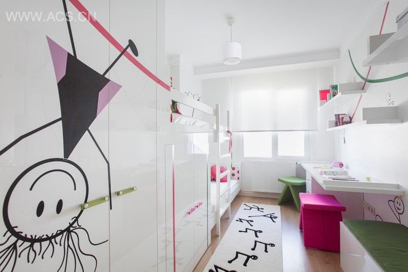 As the room is designed for long-term use, the furniture’s are designed and produced in white acrylic and the joy needed for a child’s room is given with the colors on accessories like cushions, stickers and stools.