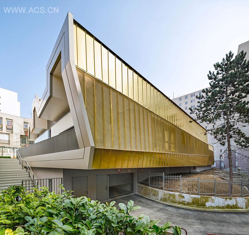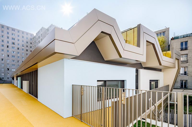 这栋在法国巴黎Piat街上的幼儿园设计灵感源自日本折纸,折纸造型的屋顶花园屋面向下弯折成为金黄色的黄铜细网墙面,将建筑面向住宅公寓的一侧包裹起来,使得幼儿园内部不能直接从街道上看见。主要入口区域也从这侧进入。幼儿园建筑在另外一侧,将住宅公寓停车场屋顶改造为色彩鲜艳的橙色院子。室内是明亮的蓝色,白色还有暖黄色基调,一共可以容纳44张儿童床。