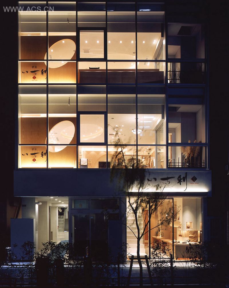 这家店出售茶叶和茶道所需的日本小商品。它位于日式服装店一楼,店内楼梯有着特别的轮廓。楼梯后面是花园,上面是一片宁静的区域。 由于空间十分狭小,设计师在前方巧妙地设计了镜子使空间看起来宽敞了一倍。前面角落的柱子上设有出售的商品,后面的高背沙发营造出宁静的气氛。