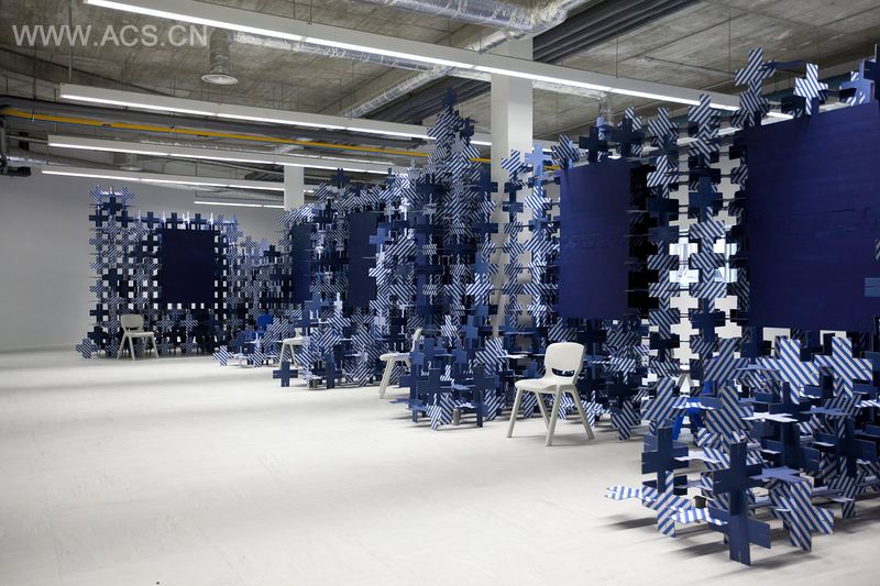 X-hibition is a self-structured system d on the multiplication and rotation of one only singular piece, a cardboard cross. Cardboard was chosen not only because it is re-usable and bio-degradable, but also because it allowed to create a weightless structure and also to easily explore of its graphic qualities – to be blue on one side and striped on the other.