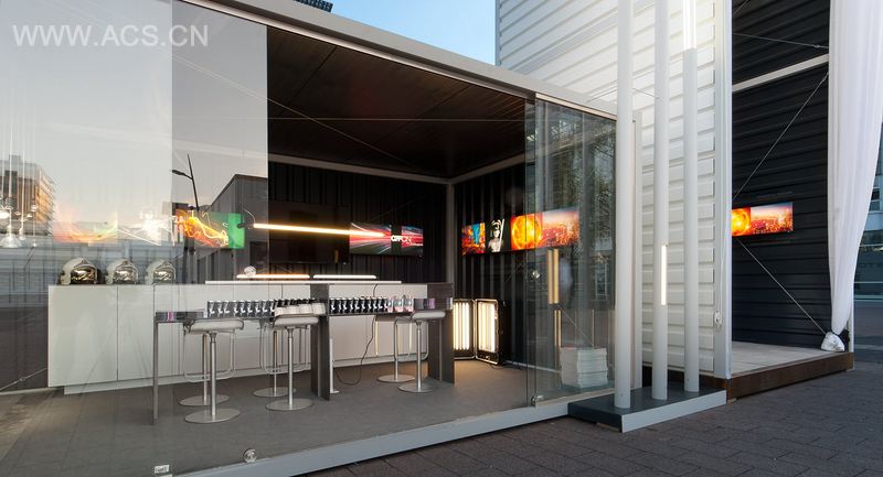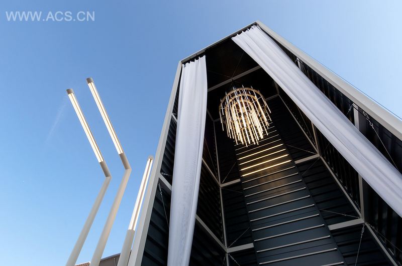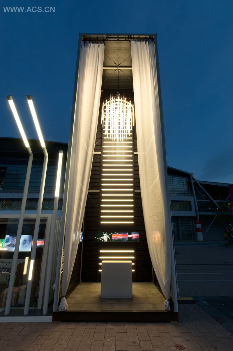 The attention directed creates atmosphere and highlights the importance of the product. To show the various applications, we built up a 10 meter high container tower with an integrated chandelier made of 53 EQ T8 LED Tubes. Visitors were able to change between different lights and drive them individually: changing light colours and energy quantity, and recognizing the amount of energy which is required at once.
