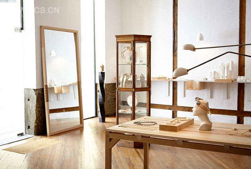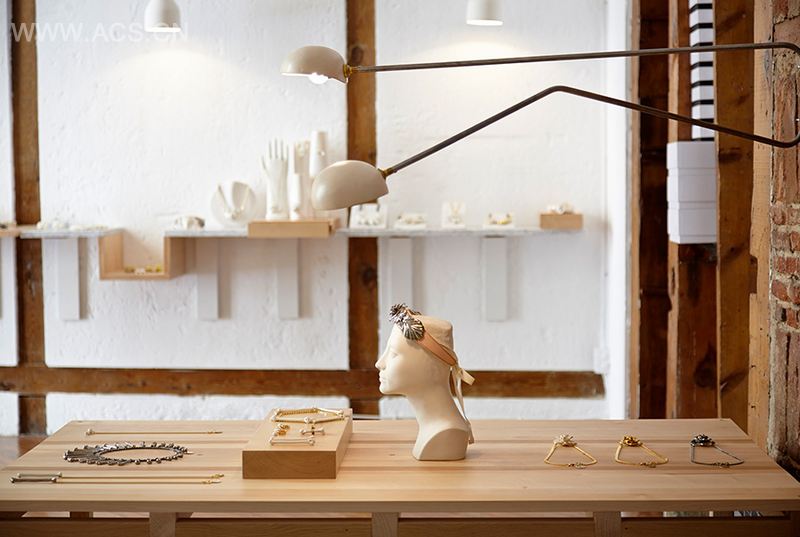 The design and furniture of ANDRESGALLARDO’s studio-shop in Madrid were thought out to give prominence to the pieces that conform his jewelry collections, and to change along with their constant evolution. As part of the designing proposal some of the original structure’s materials were rescued, like the wood beams on the walls and the stone boards. For lighting, custom made ceramic lamps that adapt and blend into the walls are directed towards the jewelry pieces.