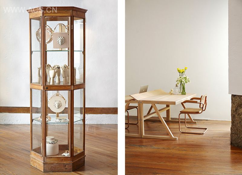 Both the distribution of space and the materials used are designed to be easily modifiable and to be renovated with each collection. The furniture was conceived under a very simple language, using neutral materials such as beechwood and Carrara marble. A modular set of shelves held by discrete custom made hardware and drawers can be used for exhibitions or storage. Two symmetrical desks made out of different woods, with distinct drawers and an inlaid mirror, were also created. These are accompanied by some old furniture that was deliberately chosen to highlight the values of the brand, like the English hexagonal showcase that replicates the shape of the interior courtyard in which the shop is located. Likewise, the working area furniture was created using similar materials to those used in the main hall, under a standard design of aesthetic lines that give priority to its use and practicality.