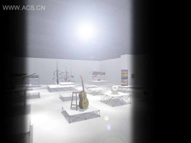 在裁切过的舞台上,乐器与真实表演时等高,再现了表演场景本身,而不仅仅是为了展示乐器。走上舞台,参观者可以体会到真实的表演氛围。每个乐器都正对着入口观众视线和演奏者的视线。